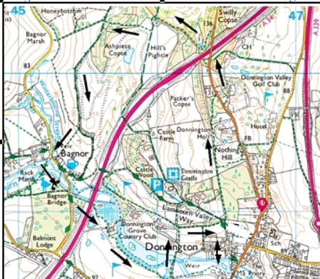 Go R up the road towards Donnington Castle to reach the cricket field where turn R on the footpath and follow this forward for about 500yds as it passes the rear of a large house and rises through woods before coming out on a main road (fast traffic!) Turn L to the bridge over the bypass, then