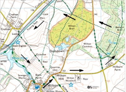 500 yds past the windmill, turn L onto a track, and in a further 250 yds, turn R onto a footpath that takes you to the track through Bedwyn Brail. After about 500yds, turn L and follow the track in a straight line for 700yds. in the wood, Emerging from the second wooded area, go half right along the larger path to join the K&A canal. Turn L on the towpath for some 800yds until you are almost opposite the Crofton Pumping Engines, then take a FP L along Wilton Water to reach the village.